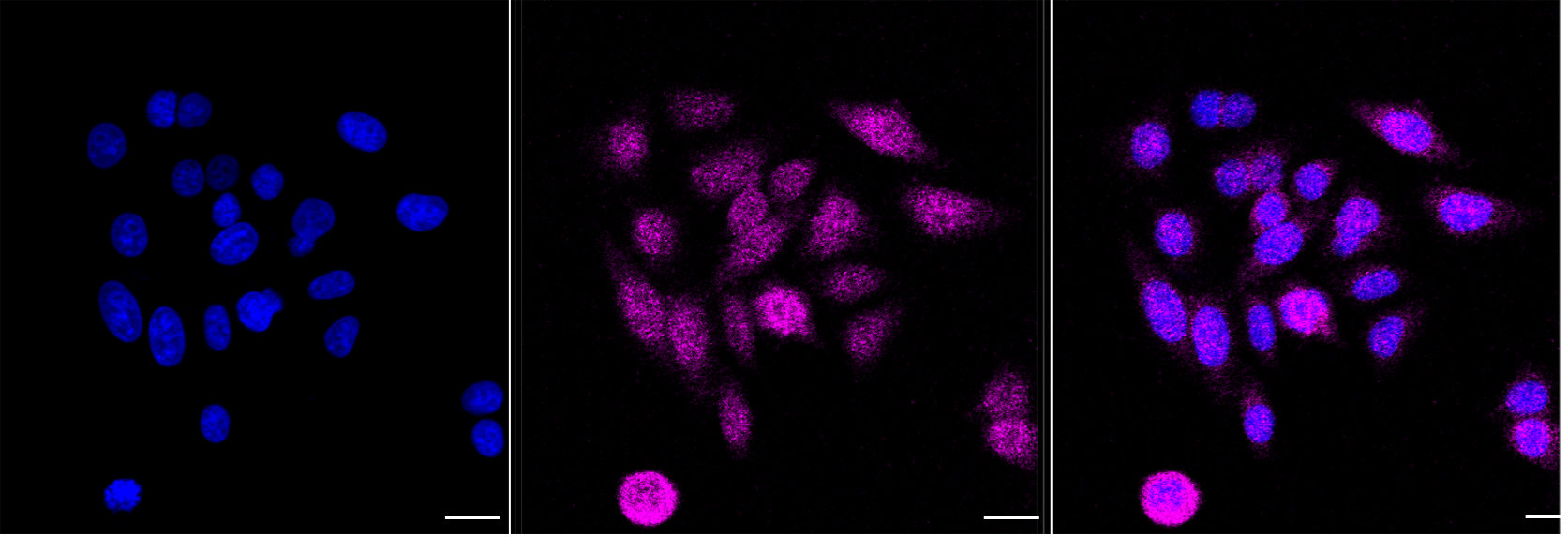 Immunocytochemical staining of HepG2 cells with Exosome component 1 antibody. Nuclei were stained blue with DAPI; Exosome component 1 was stained magenta with Alexa Fluor? 647. Images were taken using Leica stellaris 5. Protein abundance based on laser Intensity and smart gain:. Scale bar, 20 μm.
