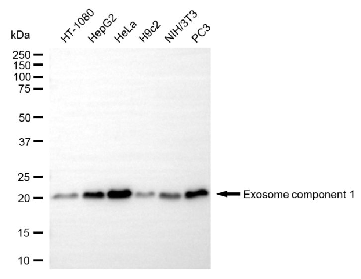 Western blotting analysis using exosome component 1 antibody. Total cell lysates (30 μg) from various cell lines were loaded and separated by SDS-PAGE. The blot was incubated with exosome component 1 antibody and HRP-conjugated goat anti-mouse secondary antibody respectively.