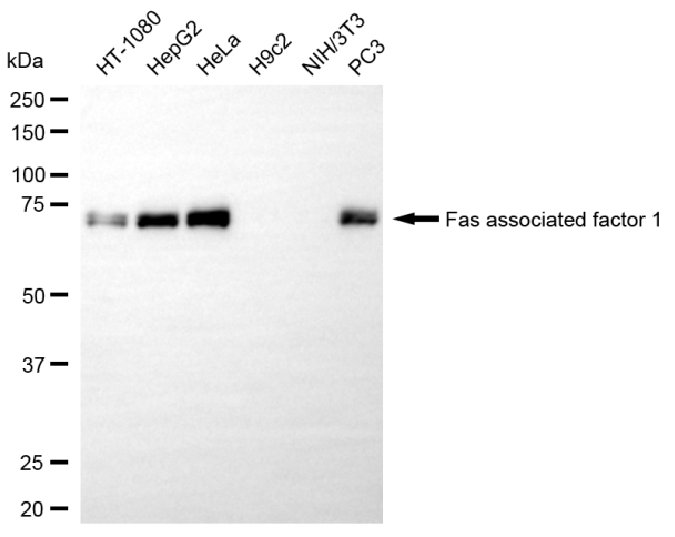 Western blotting analysis using fas associated factor 1 antibody. Total cell lysates (30 μg) from various cell lines were loaded and separated by SDS-PAGE. The blot was incubated with fas associated factor 1 antibody and HRP-conjugated goat anti-mouse secondary antibody respectively.