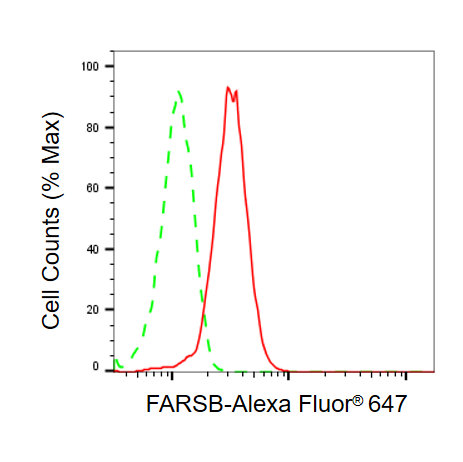Flow cytometric analysis of FARSB expression in HepG2 cells using FARSB antibody. Green, isotype control; red, FARSB.