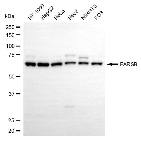 Western blotting analysis using FARSB antibody. Total cell lysates (30 μg) from various cell lines were loaded and separated by SDS-PAGE. The blot was incubated with FARSB antibody and HRP-conjugated goat anti-mouse secondary antibody respectively.