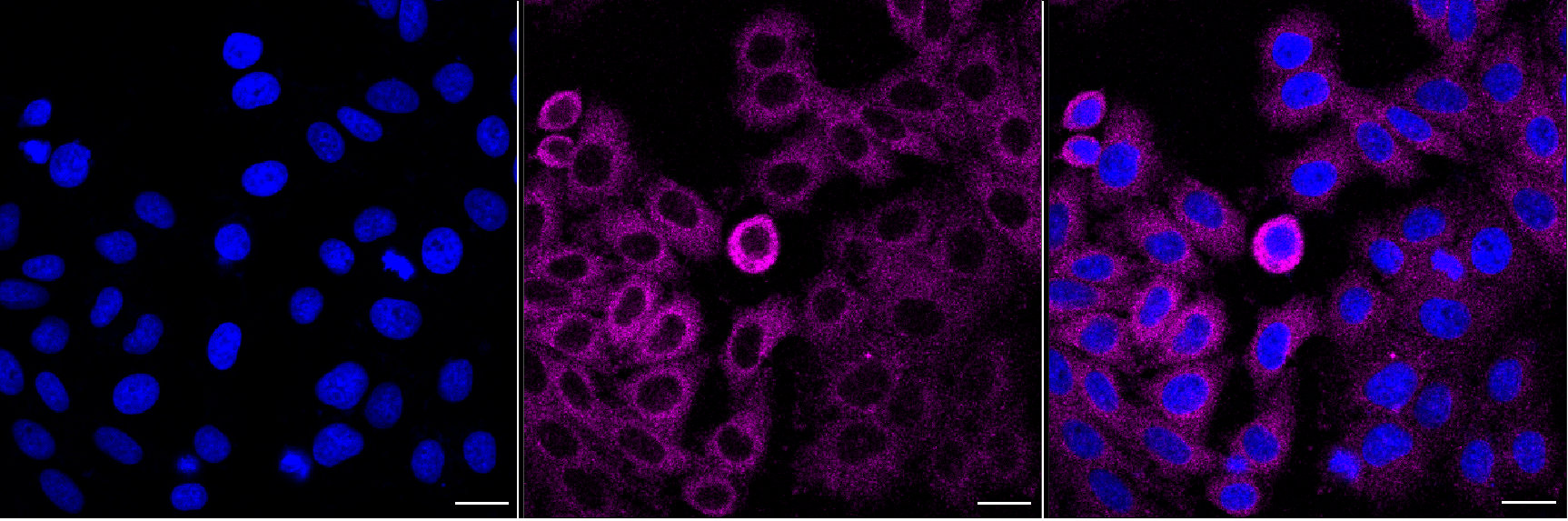 Immunocytochemical staining of HepG2 cells with FERMT2 antibody. Nuclei were stained blue with DAPI; FERMT2 was stained magenta with Alexa Fluor? 647. Images were taken using Leica stellaris 5. Protein abundance based on laser Intensity and Smart Gain: Low. Scale bar, 20 μm.