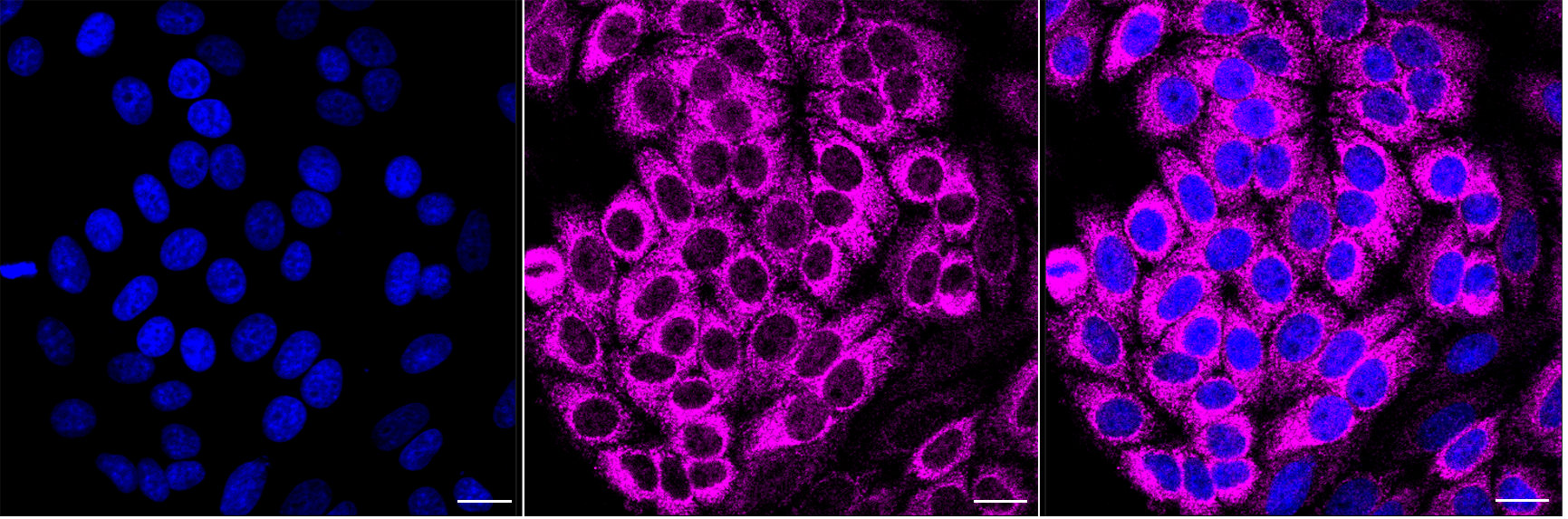 Immunocytochemical staining of HepG2 cells with Fumarate hydratase antibody. Nuclei were stained blue with DAPI; Fumarate hydratase was stained magenta with Alexa Fluor? 647. Images were taken using Leica stellaris 5. Protein abundance based on laser Intensity and smart gain:Medium. Scale bar, 20 μm.