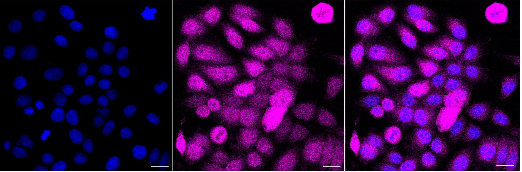 Immunocytochemical staining of HepG2 cells with GALE antibody. Nuclei were stained blue with DAPI; GALE was stained magenta with Alexa Fluor? 647. Images were taken using Leica stellaris 5. Protein abundance based on laser Intensity and smart gain: Medium. Scale bar, 20 μm.