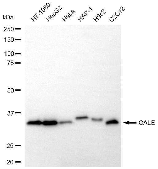 Western blotting analysis using GALE antibody. Total cell lysates (30 μg) from various cell lines were loaded and separated by SDS-PAGE. The blot was incubated with GALE antibody and HRP-conjugated goat mouse secondary antibody respectively.