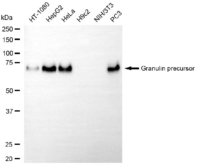 Western blotting analysis using granulin precursor antibody. Total cell lysates (30 μg) from various cell lines were loaded and separated by SDS-PAGE. The blot was incubated with granulin precursor antibody and HRP-conjugated goat anti-mouse secondary antibody respectively.