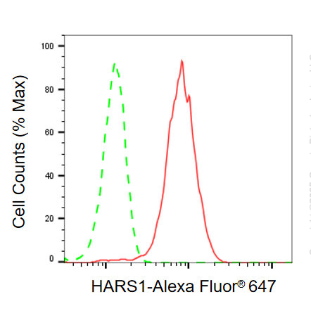 Flow cytometric analysis of HARS1 expression in HepG2 cells using HARS1 antibody. Green, isotype control; red, HARS1.