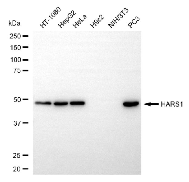 Western blotting analysis using HARS1 antibody. Total cell lysates (30 μg) from various cell lines were loaded and separated by SDS-PAGE. The blot was incubated with HARS1 antibody and HRP-conjugated goat anti-mouse secondary antibody respectively.