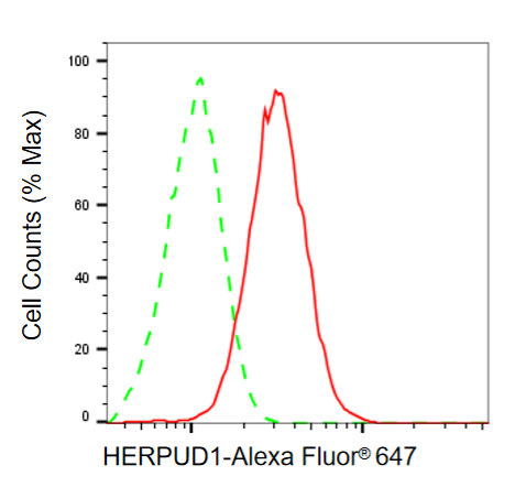 Flow cytometric analysis of HERPUD1 expression in C2C12 cells using HERPUD1 antibody. Green, isotype control; red, HERPUD1.