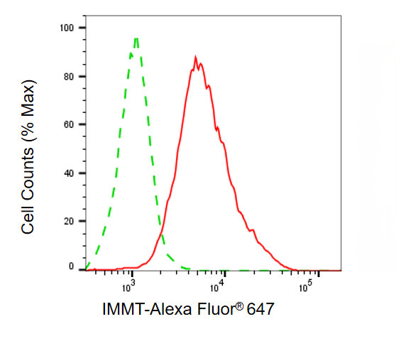 Flow cytometric analysis of IMMT expression in HepG2 cells using IMMT antibody. Green, isotype control; red, IMMT.