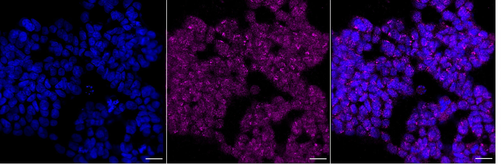 Immunocytochemical staining of HAP1 cells with Lysine demethylase 3A antibody. Nuclei were stained blue with DAPI; Lysine demethylase 3A was stained magenta with Alexa Fluor? 647. Images were taken using Leica stellaris 5. Protein abundance based on laser Intensity and smart gain: Low. Scale bar, 20 μm.