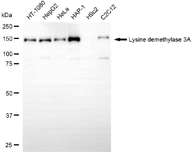Western blotting analysis using lysine demethylase 3A antibody. Total cell lysates (30 μg) from various cell lines were loaded and separated by SDS-PAGE. The blot was incubated with lysine demethylase 3A antibody and HRP-conjugated goat anti-mouse secondary antibody respectively.