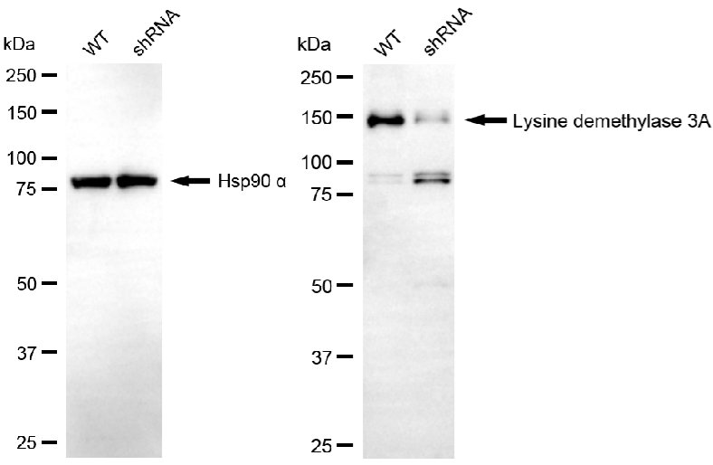 Western blotting analysis using lysine demethylase 3A antibody. Lysine demethylase 3A expression in wild-type (WT) and lysine demethylase 3A (KDM3A) shRNA knockdown (KD) HeLa cells with 20 μg of total cell lysates. Hsp90 α serves as a loading control. The blot was incubated with lysine demethylase 3A antibody and HRP-conjugated goat anti-mouse secondary antibody respectively.