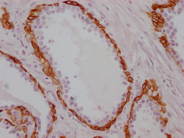 IHC image of CSB-MA986157 diluted at 1:100 and staining in paraffin-embedded human prostate cancer performed on a Leica BondTM system. After dewaxing and hydration, antigen retrieval was mediated by high pressure in a citrate buffer (pH 6.0). Section was blocked with 10% normal goat serum 30min at RT. Then primary antibody (1% BSA) was incubated at 4°C overnight. The primary is detected by a Goat anti-mouse IgG polymer labeled by HRP and visualized using 0.05% DAB.