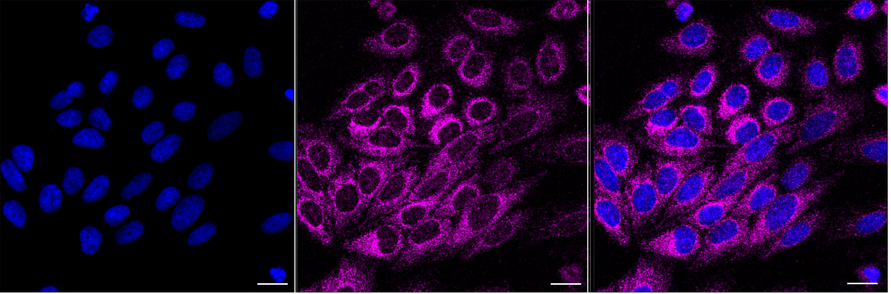 Immunocytochemical staining of HepG2 cells with NDUFB10 antibody. Nuclei were stained blue with DAPI; NDUFB10 was stained magenta with Alexa Fluor? 647. Images were taken using Leica stellaris 5. Protein abundance based on laser Intensity and smart gain: Low. Scale bar, 20 μm.