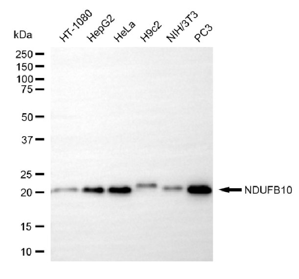 Western blotting analysis using NDUFB10 antibody. Total cell lysates (30 μg) from various cell lines were loaded and separated by SDS-PAGE. The blot was incubated with NDUFB10 antibody and HRP-conjugated goat anti-mouse secondary antibody respectively.