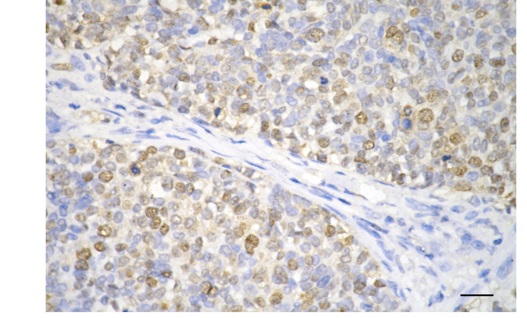 Immunohistochemistry was performed on paraffin-embedded human breast carcinoma using proliferating cell nuclear antigen antibody. Antigen retrieval was done in sodium citrate buffer (pH 6.0). DAB was used for detection, with hematoxylin counterstaining. Images were acquired using a Nikon Ci-L Plus microscope (40× objective). Scale bar: 25 μm.