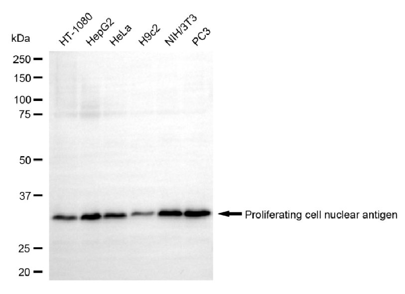 Western blotting analysis using proliferating cell nuclear antigen antibody. Total cell lysates (30 μg) from various cell lines were loaded and separated by SDS-PAGE. The blot was incubated with proliferating cell nuclear antigen antibody and HRP-conjugated goat anti-rabbit secondary antibody respectively.