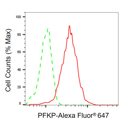 Flow cytometric analysis of PFKP expression in HepG2 cells using PFKP antibody. Green, isotype control; red, PFKP.