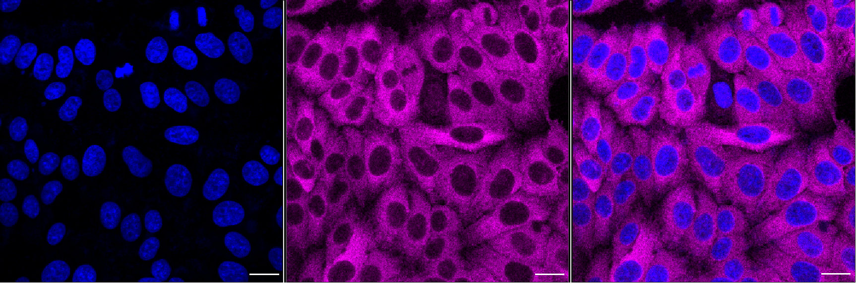 Immunocytochemical staining of HepG2 cells with PFKP antibody. Nuclei were stained blue with DAPI; PFKP was stained magenta with Alexa Fluor? 647. Images were taken using Leica stellaris 5. Protein abundance based on laser Intensity and Smart Gain: Medium. Scale bar, 20 μm.