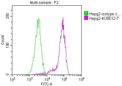 Overlay histogram showing HepG2 cells stained with CSB-MA018072A1m (red line) at 1:50. The cells were incubated in 1x PBS /10% normal goat serum to block non-specific protein-protein interactions followed by primary antibody for 1 h at 4°C. The secondary antibody used was FITC goat anti-mouse IgG(H+L) at 1/200 dilution for 1 h at 4°C. Isotype control antibody (green line) was used under the same conditions. Acquisition of >10,000 events was performed.