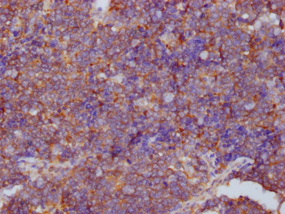 IHC image of CSB-MA018072A1m diluted at 1:1000 and staining in paraffin-embedded human tonsil tissue performed on a Leica BondTM system. After dewaxing and hydration, antigen retrieval was mediated by high pressure in a citrate buffer (pH 6.0). Section was blocked with 10% normal goat serum 30min at RT. Then primary antibody (1% BSA) was incubated at 4°C overnight. The primary is detected by a biotinylated secondary antibody and visualized using an HRP conjugated SP system.
