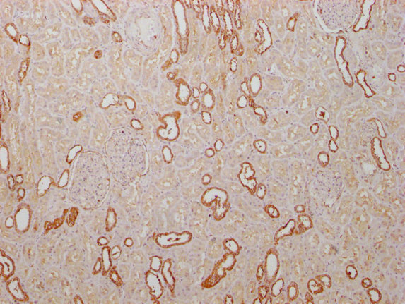 IHC image of CSB-MA018072A1m diluted at 1:1000 and staining in paraffin-embedded human kidney tissue performed on a Leica BondTM system. After dewaxing and hydration, antigen retrieval was mediated by high pressure in a citrate buffer (pH 6.0). Section was blocked with 10% normal goat serum 30min at RT. Then primary antibody (1% BSA) was incubated at 4°C overnight. The primary is detected by a biotinylated secondary antibody and visualized using an HRP conjugated SP system.