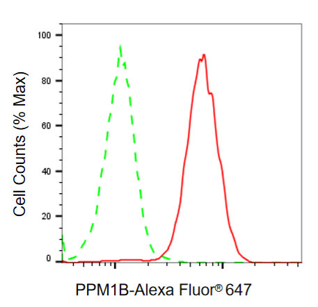 Flow cytometric analysis of PPM1B expression in HepG2 cells using PPM1B antibody. Green, isotype control; red, PPM1B.