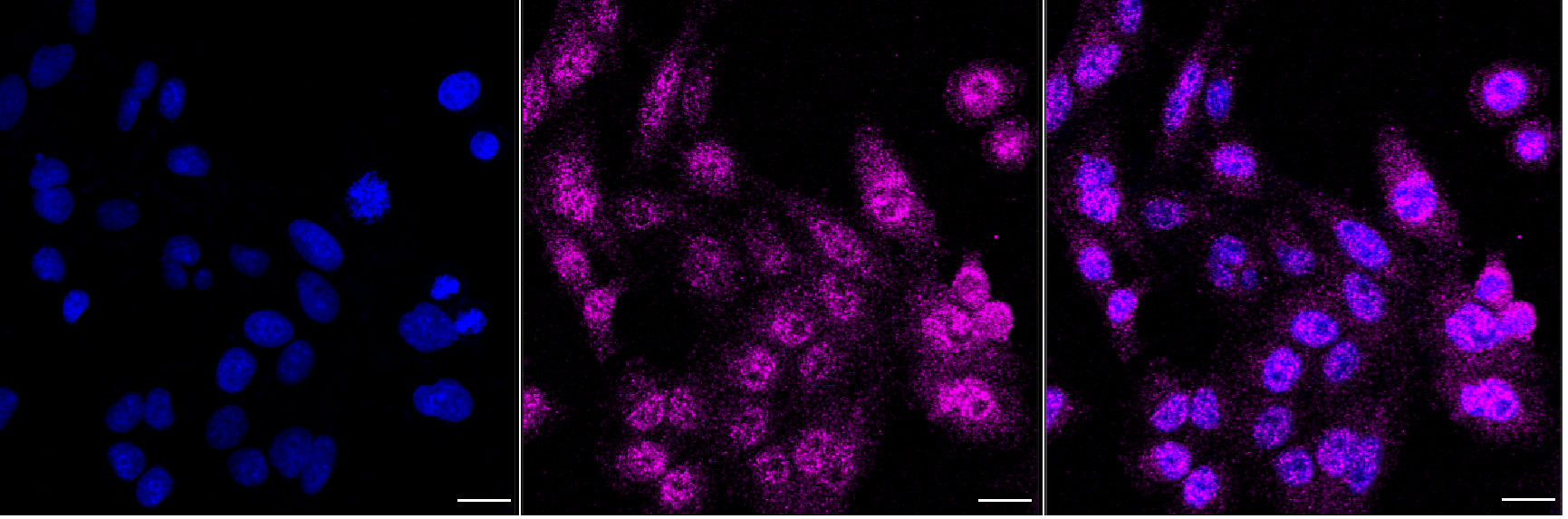 Immunocytochemical staining of HepG2 cells with PPM1B antibody. Nuclei were stained blue with DAPI; PPM1B was stained magenta with Alexa Fluor? 647. Images were taken using Leica stellaris 5. Protein abundance based on laser Intensity and smart gain: Low. Scale bar, 20 μm.