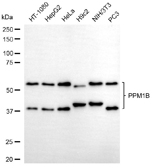 Western blotting analysis using PPM1B antibody. Total cell lysates (30 μg) from various cell lines were loaded and separated by SDS-PAGE. The blot was incubated with PPM1B antibody and HRP-conjugated goat anti-mouse secondary antibody respectively.