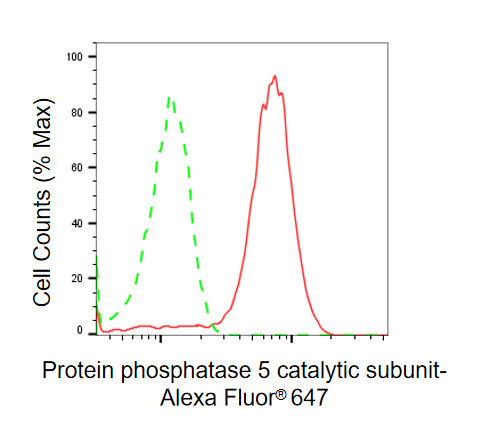 Flow cytometric analysis of Protein phosphatase 5 catalytic subunit expression in HepG2 cells using Protein phosphatase 5 catalytic subunit antibody. Green, isotype control; red, Protein phosphatase 5 catalytic subunit.