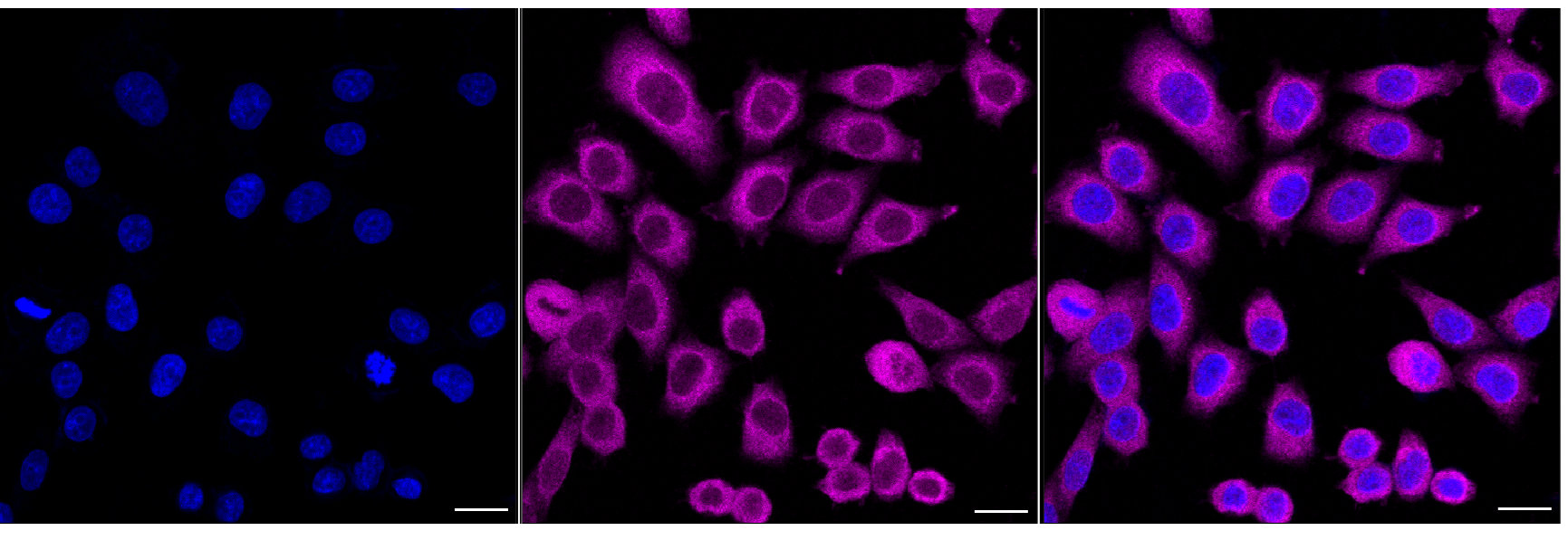 Immunocytochemical staining of HepG2 cells with Protein phosphatase 5 catalytic subunit antibody. Nuclei were stained blue with DAPI; Protein phosphatase 5 catalytic subunit was stained magenta with Alexa Fluor? 647. Images were taken using Leica stellaris 5. Protein abundance based on laser Intensity and smart gain:Medium. Scale bar, 20 μm.