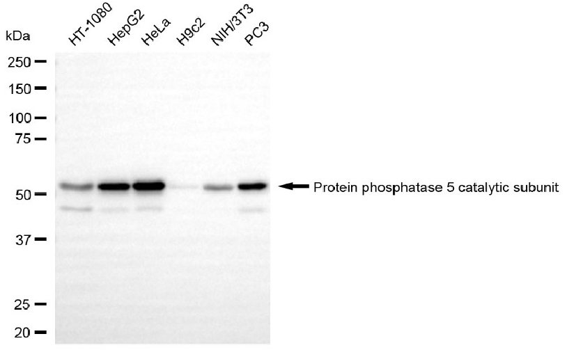 Western blotting analysis using protein phosphatase 5 catalytic subunit antibody. Total cell lysates (30 μg) from various cell lines were loaded and separated by SDS-PAGE. The blot was incubated with protein phosphatase 5 catalytic subunit antibody and HRP-conjugated goat mouse secondary antibody respectively.