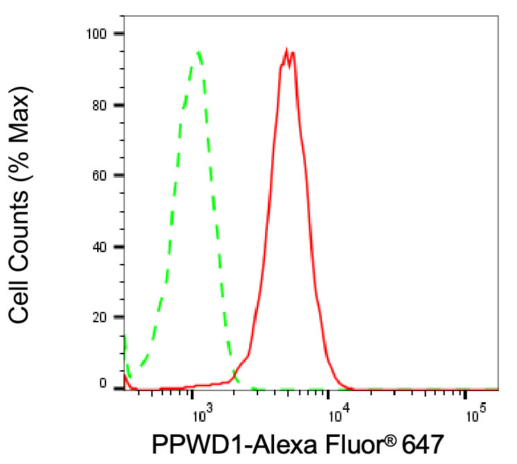 Flow cytometric analysis of PPWD1 expression in HeLa cells using PPWD1 antibody. Green, isotype control; red, PPWD1.