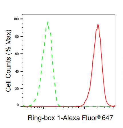 Flow cytometric analysis of Ring-box 1 expression in C2C12 cells using Ring-box 1 antibody. Green, isotype control; red, Ring-box 1.