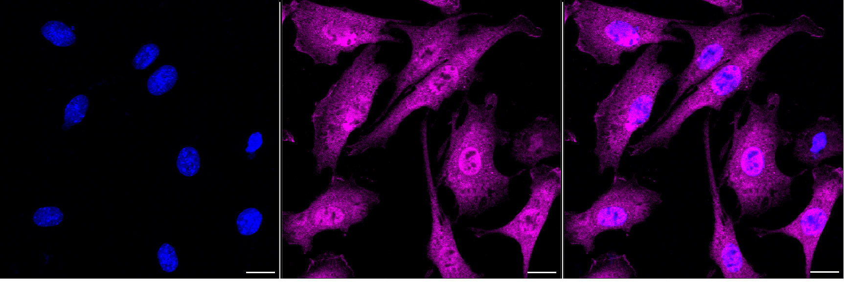 Immunocytochemical staining of C2C12 cells with Ring-box 1 antibody. Nuclei were stained blue with DAPI; Ring-box 1 was stained magenta with Alexa Fluor? 647. Images were taken using Leica stellaris 5. Protein abundance based on laser Intensity and smart gain: High. Scale bar, 20 μm.