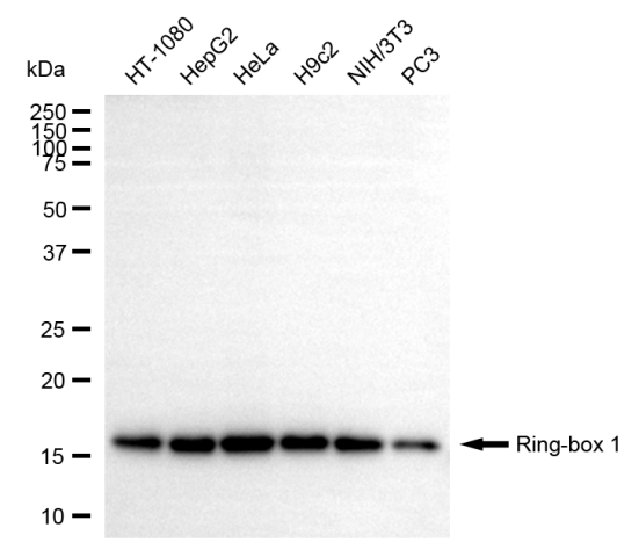 Western blotting analysis using ring-box 1 antibody. Total cell lysates (30 μg) from various cell lines were loaded and separated by SDS-PAGE. The blot was incubated with ring-box 1 antibody and HRP-conjugated goat anti-mouse secondary antibody respectively.
