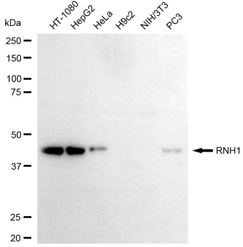 Western blotting analysis using RNH1 antibody. Total cell lysates (30 μg) from various cell lines were loaded and separated by SDS-PAGE. The blot was incubated with RNH1 antibody and HRP-conjugated goat anti-mouse secondary antibody respectively.