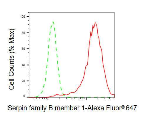 Flow cytometric analysis of Serpin family B member 1 expression in HepG2 cells using Serpin family B member 1 antibody. Green, isotype control; red, Serpin family B member 1.