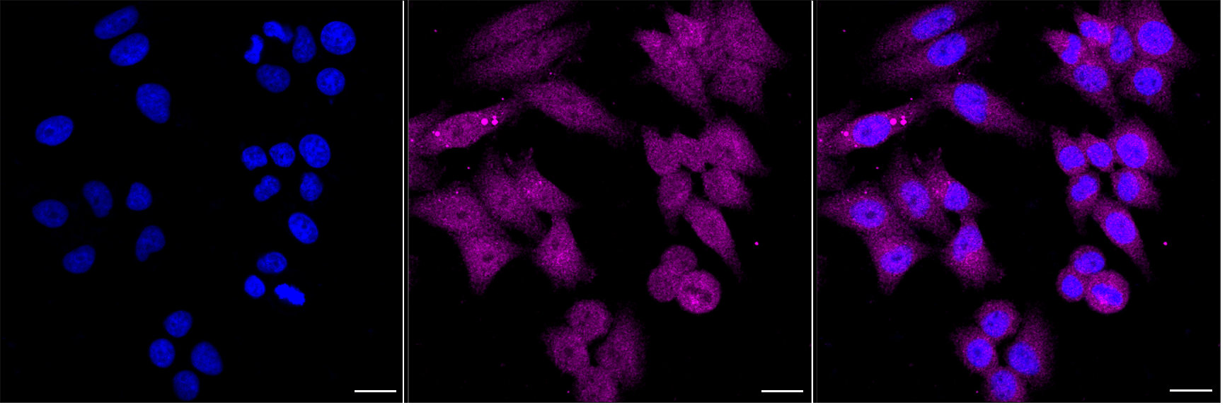 Immunocytochemical staining of HepG2 cells with Serpin family B member 1 antibody. Nuclei were stained blue with DAPI; Serpin family B member 1 was stained magenta with Alexa Fluor? 647. Images were taken using Leica stellaris 5. Protein abundance based on laser Intensity and Smart Gain:Medium. Scale bar, 20 μm.