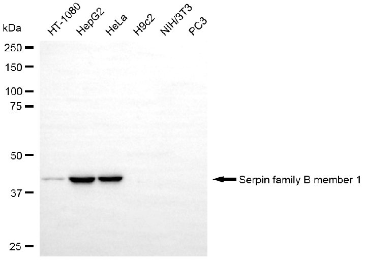 Western blotting analysis using serpin family B member 1 antibody. Total cell lysates (30 μg) from various cell lines were loaded and separated by SDS-PAGE. The blot was incubated with serpin family B member 1 antibody and HRP-conjugated goat anti-mouse secondary antibody respectively.