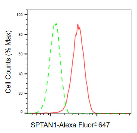 Flow cytometric analysis of SPTAN1 expression in C2C12 cells using SPTAN1 antibody. Green, isotype control; red, SPTAN1.