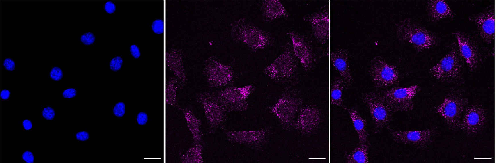 Immunocytochemical staining of C2C12 cells with SPTAN1 antibody. Nuclei were stained blue with DAPI; SPTAN1 was stained magenta with Alexa Fluor? 647. Images were taken using Leica stellaris 5. Protein abundance based on laser Intensity and smart gain: Low. Scale bar, 20 μm. Permeabilization: Triton.