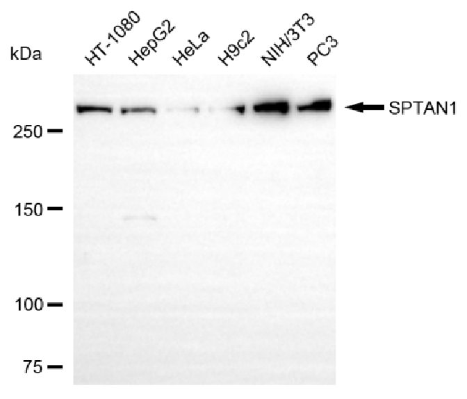 Western blotting analysis using SPTAN1 antibody. Total cell lysates (30 μg) from various cell lines were loaded and separated by SDS-PAGE. The blot was incubated with SPTAN1 antibody and HRP-conjugated goat mouse secondary antibody respectively.