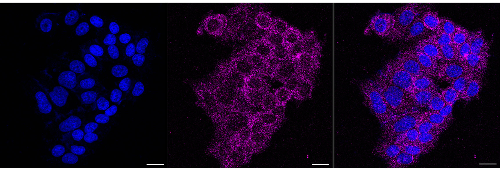 Immunocytochemical staining of HepG2 cells with SRPK2 antibody. Nuclei were stained blue with DAPI; SRPK2 was stained magenta with Alexa Fluor? 647. Images were taken using Leica stellaris 5. Protein abundance based on laser Intensity and smart gain:Low. Scale bar, 20 μm.