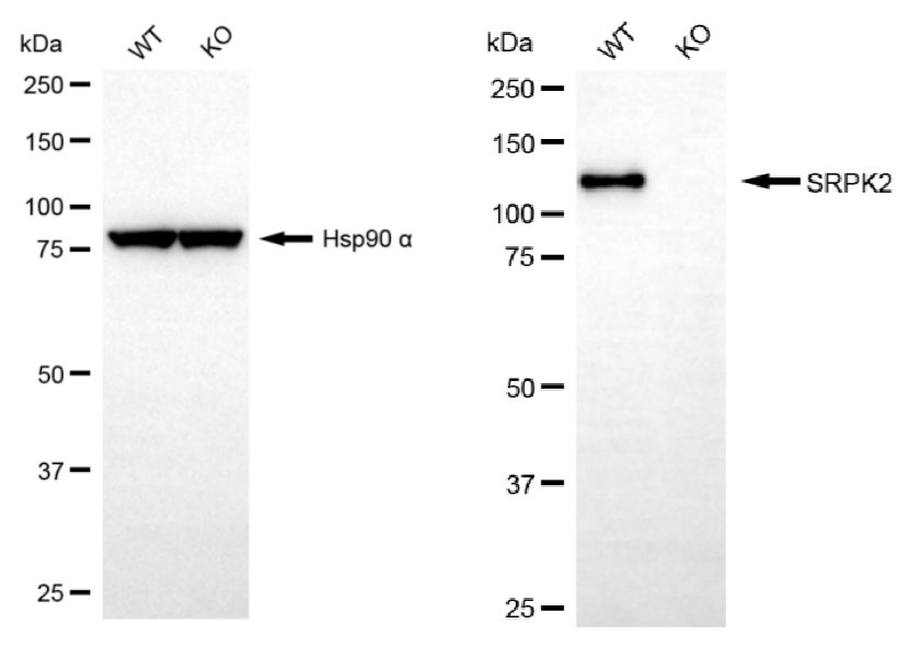 Western blotting analysis using SRPK2 antibody. SRPK2 expression in wild type (WT) and SRPK2 knockout (KO) HeLa cells with 30 μg of total cell lysates. Hsp90 α serves as a loading control. The blot was incubated with SRPK2 antibody and HRP-conjugated goat anti-mouse secondary antibody respectively.