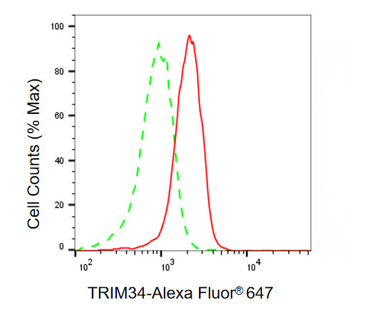 Flow cytometric analysis of TRIM34 expression in HaCaT cells using TRIM34 antibody. Green, isotype control; red, TRIM34.