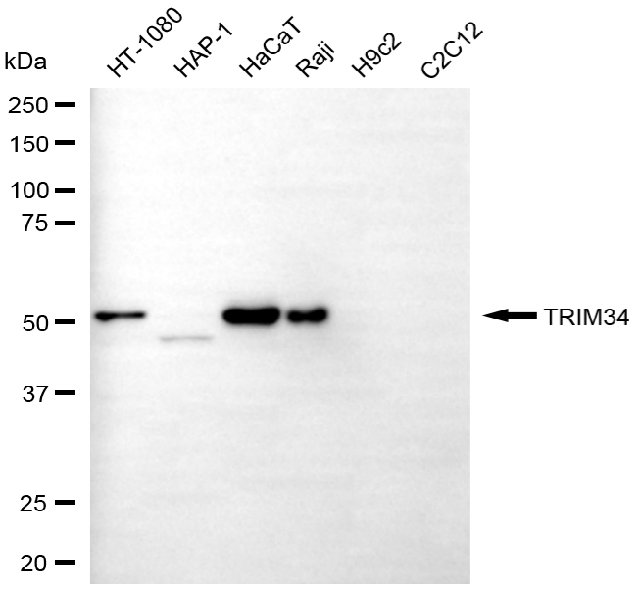 Western blotting analysis using TRIM34 antibody. Total cell lysates (30 μg) from various cell lines were loaded and separated by SDS-PAGE. The blot was incubated with TRIM34 antibody and HRP-conjugated goat anti-mouse secondary antibody respectively.