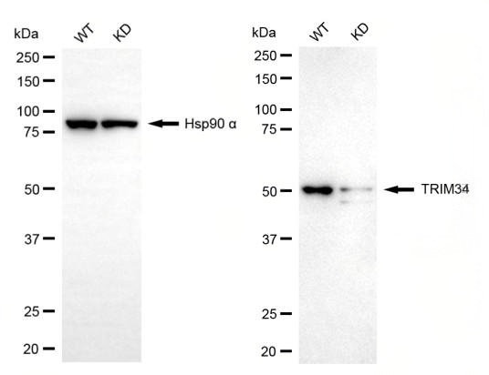 Western blotting analysis using TRIM34 antibody. TRIM34 expression in wild-type (WT) and TRIM34 shRNA knockdown (KD) HeLa cells with 20 μg of total cell lysates. Hsp90 α serves as a loading control. The blot was incubated with TRIM34 antibody and HRP-conjugated goat anti-mouse secondary antibody respectively.