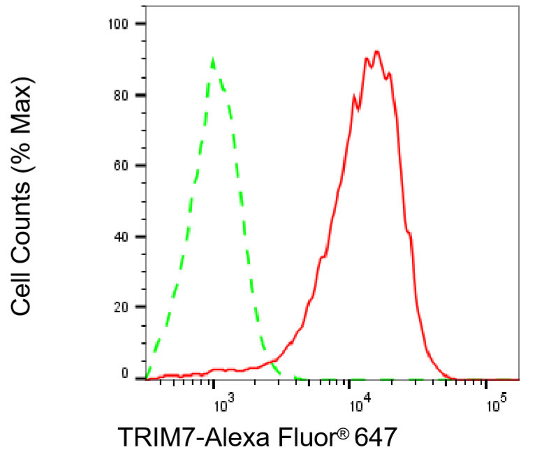 Flow cytometric analysis of TRIM7 expression in HeLa cells using TRIM7 antibody. Green, isotype control; red, TRIM7.
